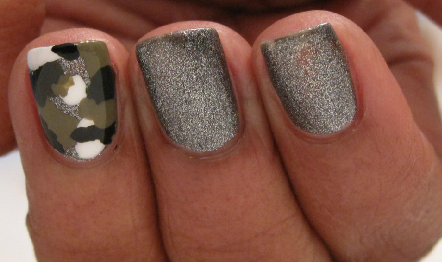 DeleteThe camo accent nail is really cool! And this is a gorgeous silver. I love the finish and texture it has. :)